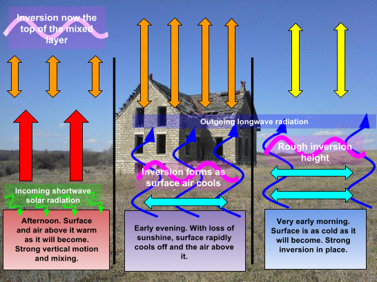 Figure 2. Breakdown of afternoon mixing/vertical motion and development/maturity of a surface inversion at night.