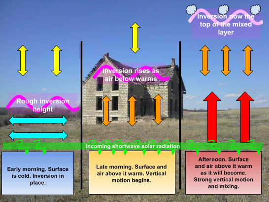 Figure 1. Development of the mixed layer that creates upward motion and good dispersion on a sunny day.