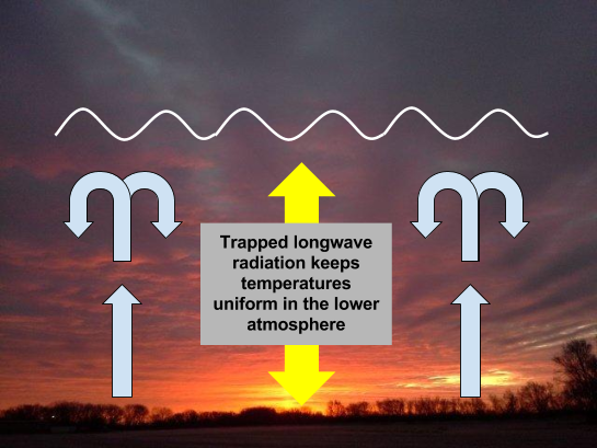 Figure 4. Trapped longwave radiation overnight will act as a lid and keep temperatures warmer throughout the profile. This will usually act as an inhibitor to inversion development.