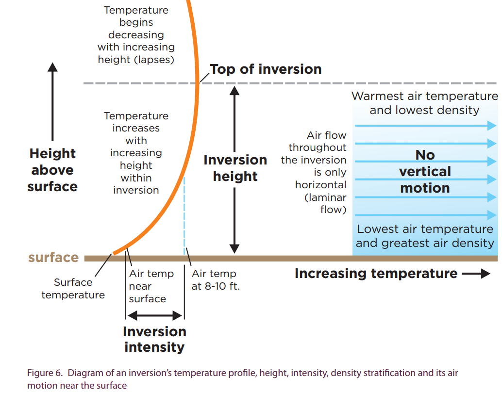 Enz, J. W.; Hofman, V., and Thostenson, A. 2014. Air Temperature Inversions: Causes, Characteristics and Potential Effects on Pesticide Spray Drift. AE-1705. NDSU Extension Service publication.