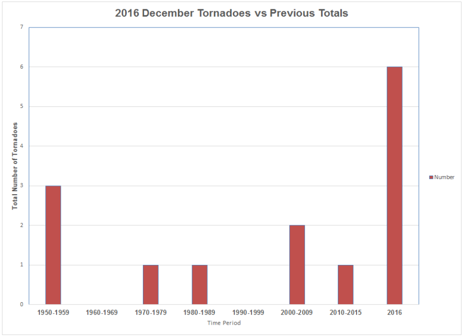 With the total of six tornadoes, 2016 had more than a decade’s worth of December tornadoes, and nearly double the previous high point of 3 between 1950 and 1959, all occurring in 1956. It is important to note that detection methods were less reliable in the early part of the record, and weak tornadoes were often not recorded.